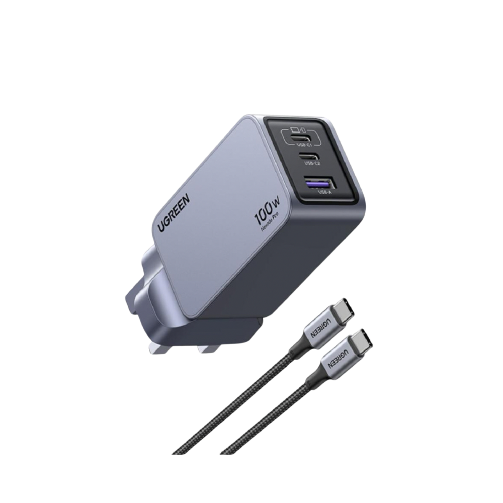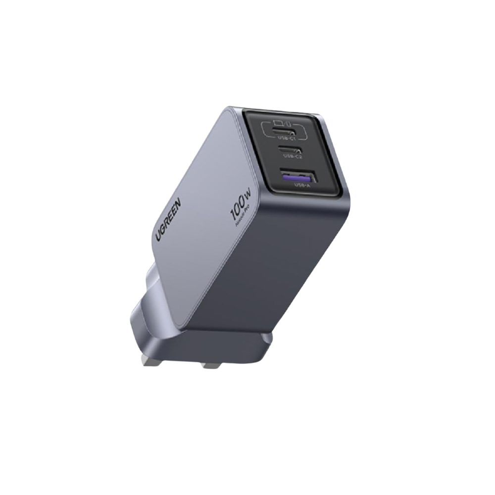 - شاحن يوجرين 100 واط مزود بمنفذين USB-C ومنفذ USB-A ما يتيح شحن ثلاثة أجهزة في وقت واحد بكفاءة عالية.